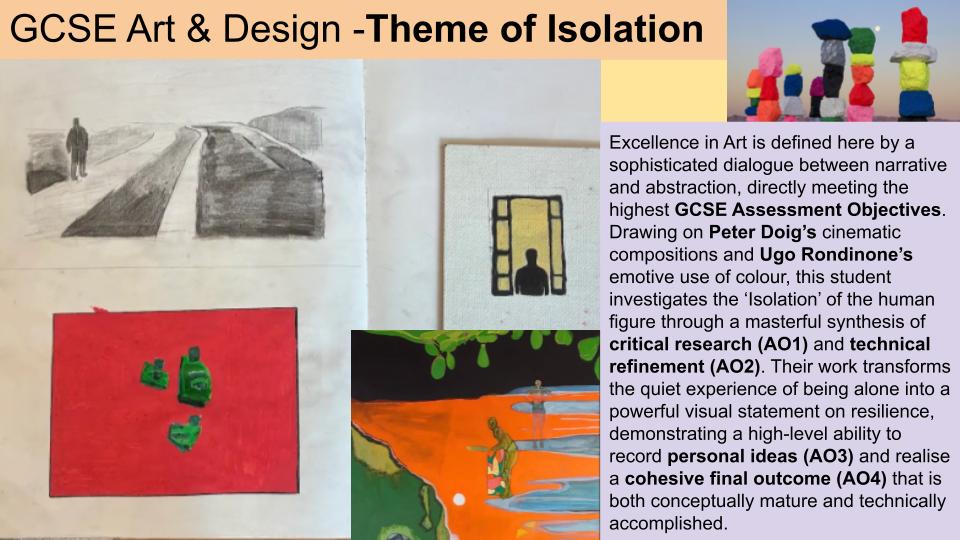 In this GCSE unit, Denis (Y10) explored the human face through an experimental lens. His work prioritises the interplay of colour and dynamic mark-making to build texture and depth within his portraits.